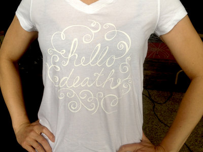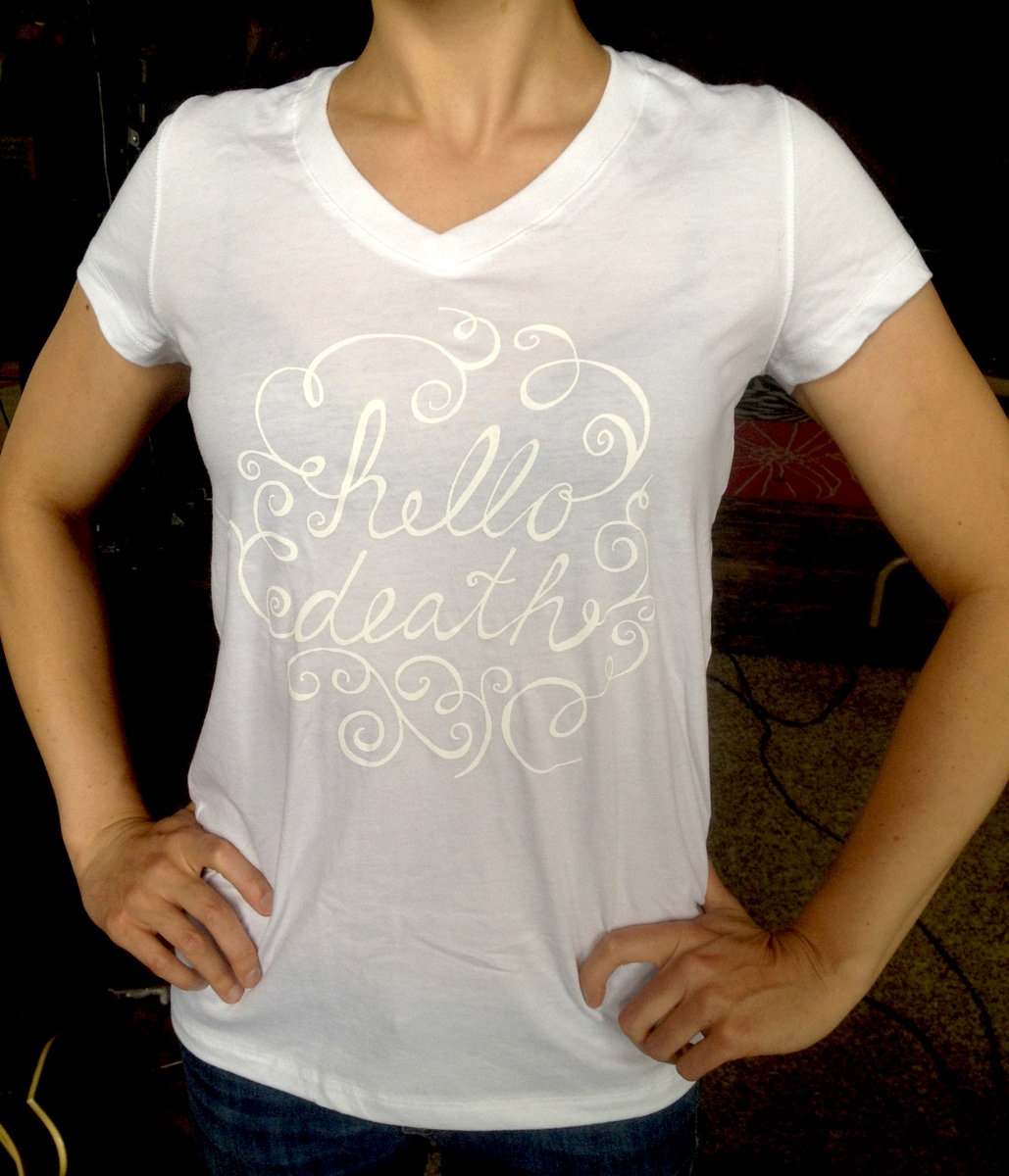 Hello Death swirl logo on soft v-neck shirt. Subtle and elegant white ink on white fabric. Available (for now) only in small. Designed by Diana Ehlers and printed by local Milwaukee screen print masters Orchard Street Press.
